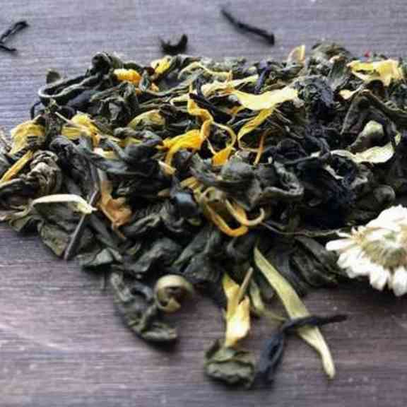 Крупный листовой чёрный чай с кусочками персика, лепестками подсолнечника и соцветиями ромашки