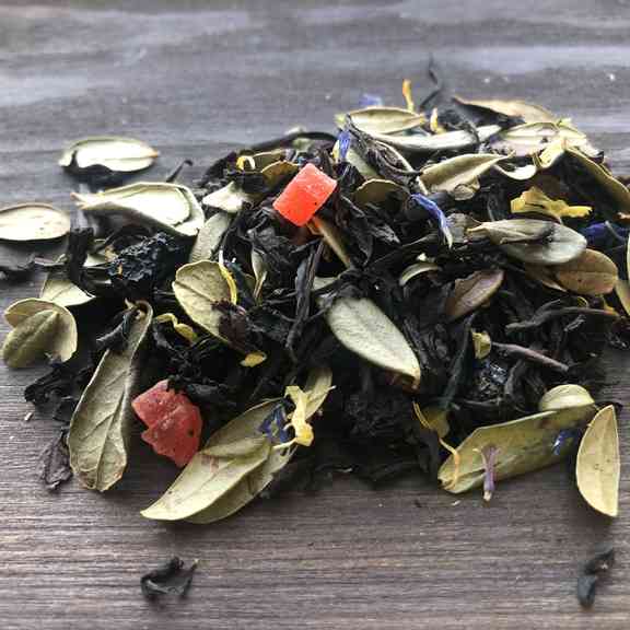 Купаж чёрного индийского чая, целый лист брусники, лепестки календулы и василька, ягоды рябины черноплодной, цукаты ананаса