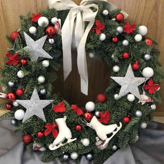 ярко-алый и белый оттенок декора будет приятным цветом в наступающем новом году дракона. венок ручной работы из «вкусных» веточек нобилиса