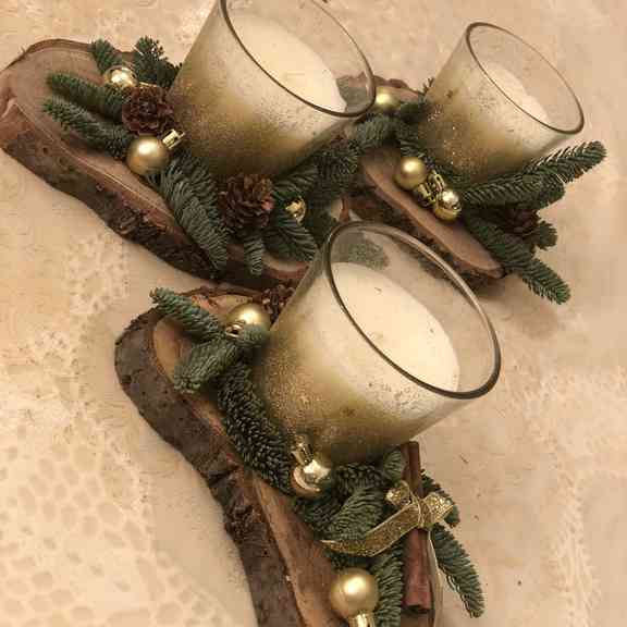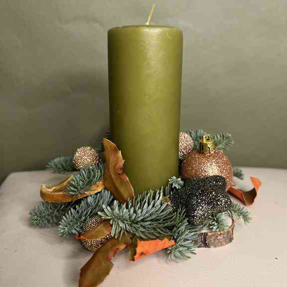свеча ручной работы на срубе дерева с веточками нобилиса. цветовую гамму можно сделать в вашем любимом цвете