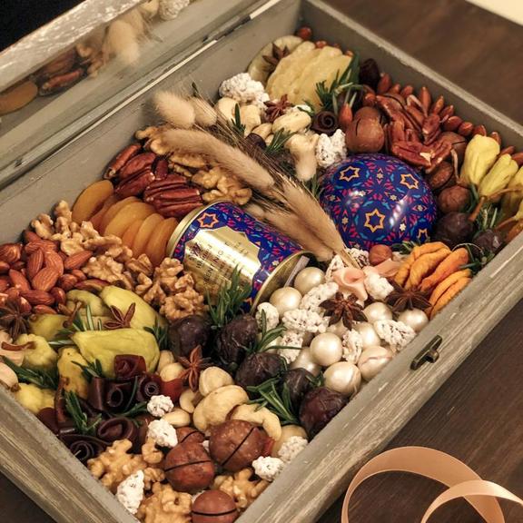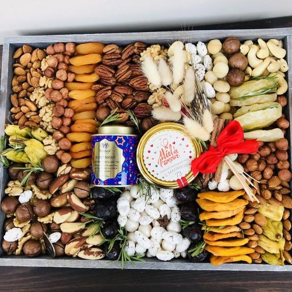 Состав: Чай, конфеты, орех макадамия неочищенный, груша сушёная Армения, персик сушеный Армения, ананас засахаренный, кешью, пастила, орех грецкий Чили, курага отборная узбекская, миндаль, миндаль сахарный, орехи в белом шоколаде, пекан, финики королевские.
