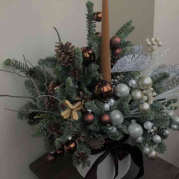 композиция с пышным нобилисом в размере XL с большой свечей премиум качества, в коричневом и белом оттенке