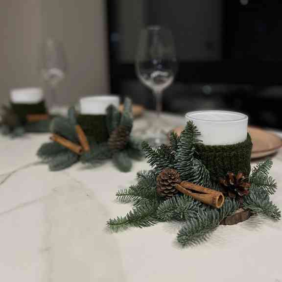 союз веточек сосны, нобилиса, можжевельника подарят богатый аромат, яркий оранжевый и тёплый голубой цвета декора очаруют вас своей красотой, а свечи добавят нотку уюта в ваш праздник
