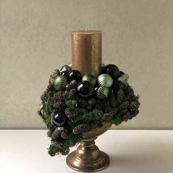 свеча ручной работы на срубе дерева с веточками нобилиса. цветовую гамму можно сделать в вашем любимом цвете